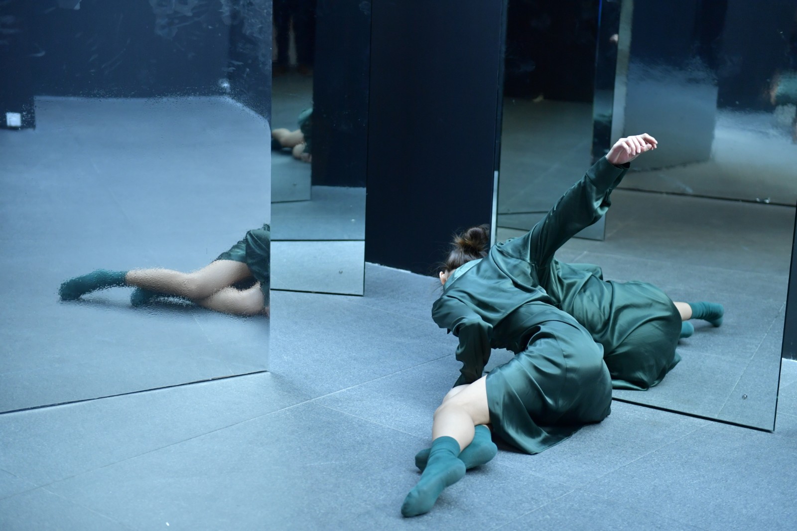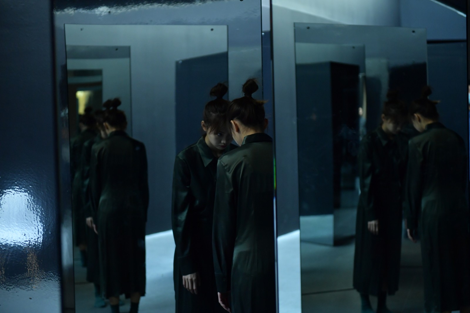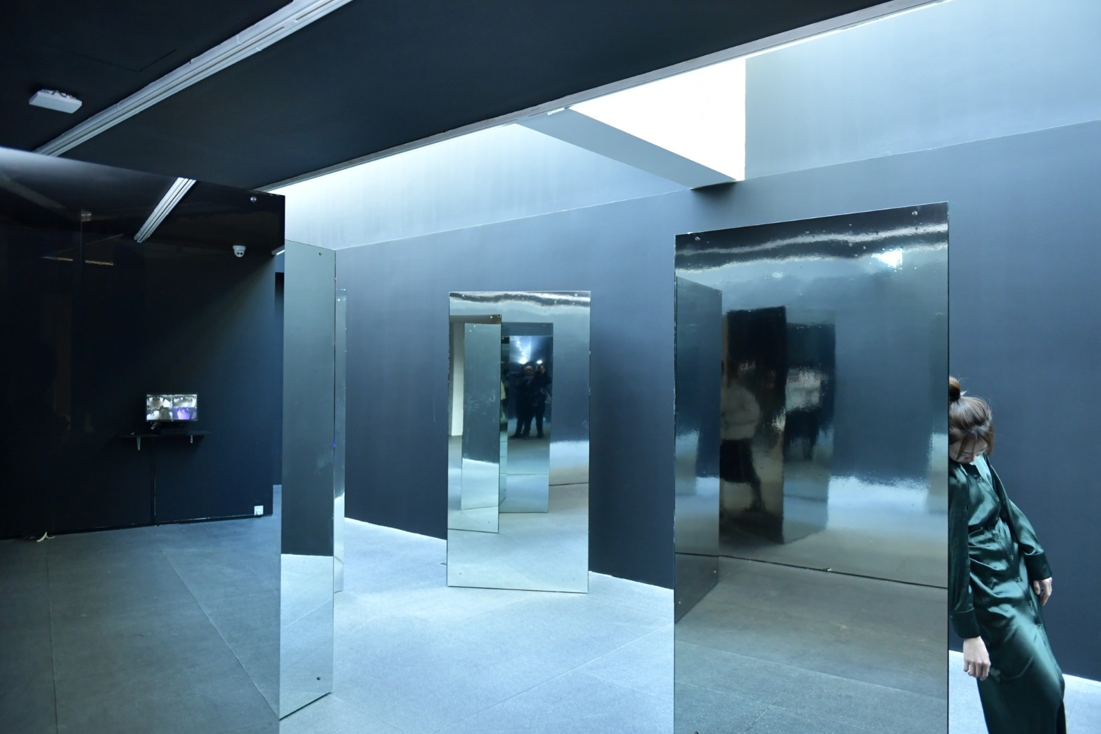 在OCAT研究中心展廳最明亮而寬闊的長走廊上,紙老虎工作室借助六個(gè)鏡面反射的三棱柱營造了一個(gè)劇場式的空間,邀請(qǐng)觀眾進(jìn)入并參與到劇目的演繹與發(fā)展中來。鏡面反射著“我”和周圍的環(huán)境,清晰地呈現(xiàn)著“我”在環(huán)境中的位置。