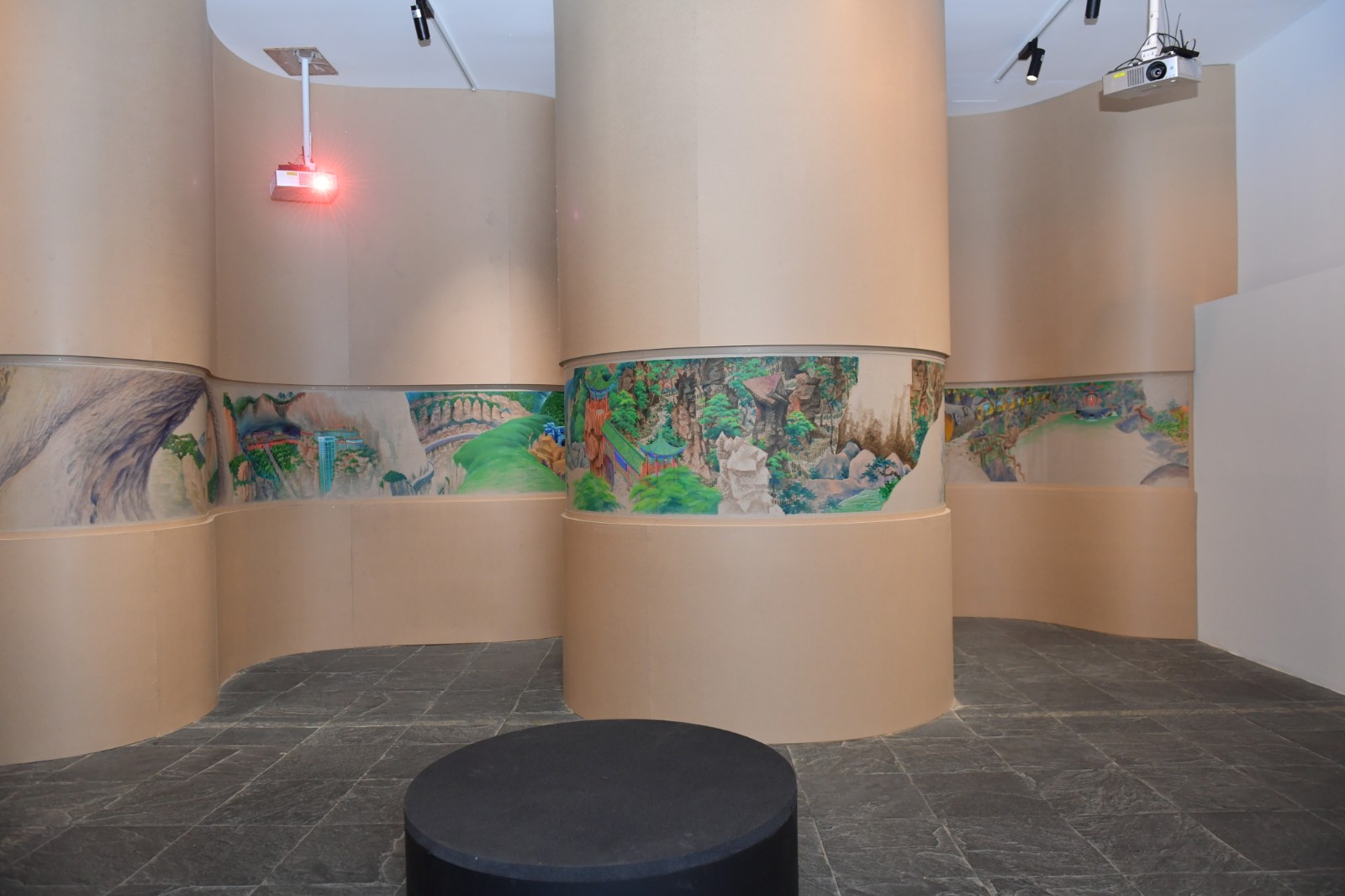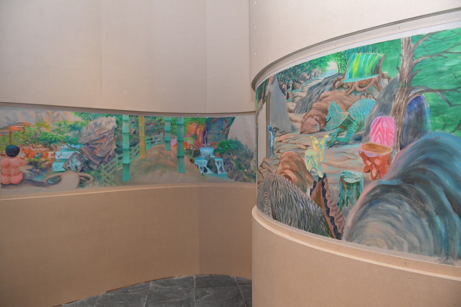 “地洞”一旁是展廳的下沉區(qū)域,這里被策展人設(shè)計(jì)為去往“桃花源”的實(shí)體路徑。梁碩的《景了個(gè)區(qū)》出現(xiàn)在這個(gè)下沉空間的一排四個(gè)口袋式的連續(xù)隔間墻面上,從空間上來說是無比契合的?;仡櫫捍T2019年在北京公社的展覽《梁碩:景區(qū)》同樣可以見到這樣一種迂回的觀展路徑。“景區(qū)”這個(gè)概念的提出,在藝術(shù)家看來代表著今天人們對(duì)山水的理解,這個(gè)獨(dú)特的概念跨越了自然景觀與都市空間。梁碩在自己撰文的《景了個(gè)區(qū)》中復(fù)原了一個(gè)景區(qū)籌備建立起來的小故事,承包景區(qū)改造的劉工在工期接近尾聲時(shí),看到自己的“杰作”時(shí)不由感嘆:“這些水泥造物,居然都妥妥的在那了,像是本來就是從山里長出來的,那巨大的假山石和假樹根顯得造型怪異,卻頗得陳老蓮氣韻,在落日的余暉中與真山融為一體,真山也像了假山……”[6]景區(qū)的建立勢(shì)必意味著人工、商業(yè)、消費(fèi)對(duì)自然景觀的直接侵入與改造,空間、審美、意識(shí)形態(tài)等一系列問題由此發(fā)生。