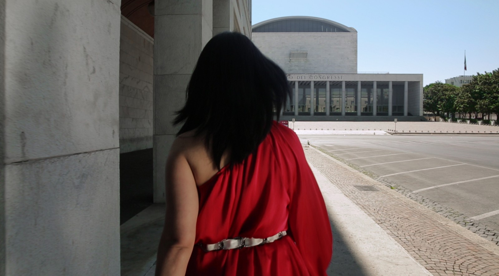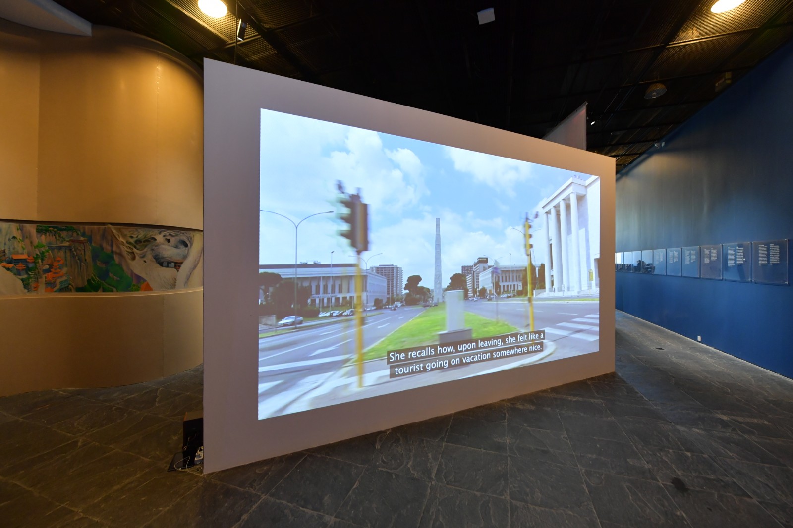 梅·海瑟格(Maj Hasager)《我們將在盲點(diǎn)相遇》是展覽呈現(xiàn)的最后一件作品,其講述了關(guān)于羅馬新城EUR區(qū)(Esposizione Universale di Roma)里的菲律賓移民的故事。這座由墨索里尼親自監(jiān)督設(shè)計(jì)的,以法西斯美學(xué)構(gòu)想出來的烏托邦城市,直至1960年才建成并被逐步被開發(fā)為羅馬新的富人區(qū)。海瑟格把眾多意大利導(dǎo)演在EUR區(qū)攝制的紀(jì)錄片、電影所刻畫的城市公共記憶,與這群定期在市中心一座教堂的地下室聚會(huì)的移民社群一同放入她的影像作品中,影像記錄了這個(gè)群體的閑暇時(shí)光,以一種個(gè)人的、私密的視角探索了菲律賓移民的私人記憶與生活如何融入并生存于這座有著強(qiáng)大歷史記憶的城市之中。正如約翰·伯格(John Berger)在《第七人》中的論述:“兩群不同的人在任何情況下,永遠(yuǎn)都是共性大于差異性的。只是由于種種原因,環(huán)境蒙蔽了人們的眼睛?!盵7]我們看得見的是歷史的記憶碾壓而過留下的軋痕以及其帶來的城市變遷,而看不見的是居于其中的人是如何在此種變遷中安放自我的記憶與故事。從這個(gè)立意來看,展覽所討論的議題似乎又回溯到了“公共”與“私人”,“歷史”與“記憶”之間的連接,然而涉及的場域已經(jīng)擴(kuò)展到了一個(gè)城市或是一種文化以外。