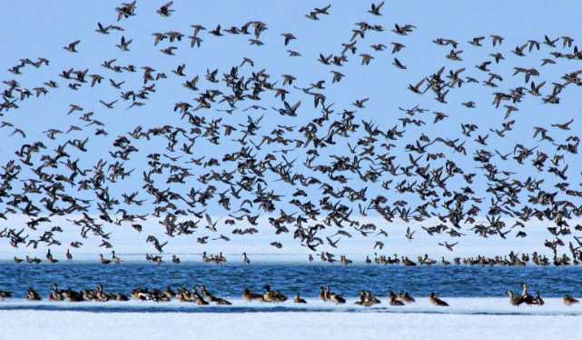 在雁窩島國家級生態(tài)濕地自然保護(hù)區(qū)內(nèi)的冰面上,白鸛、灰鸛還有小水雞,三五一組,有的悠閑散步,有的仰頭眺望,有的在融化的雪水中覓食,還有的在低空盤旋。比往年提前10天到來的候鳥,為雁窩島增添了初春的氣息和生機。