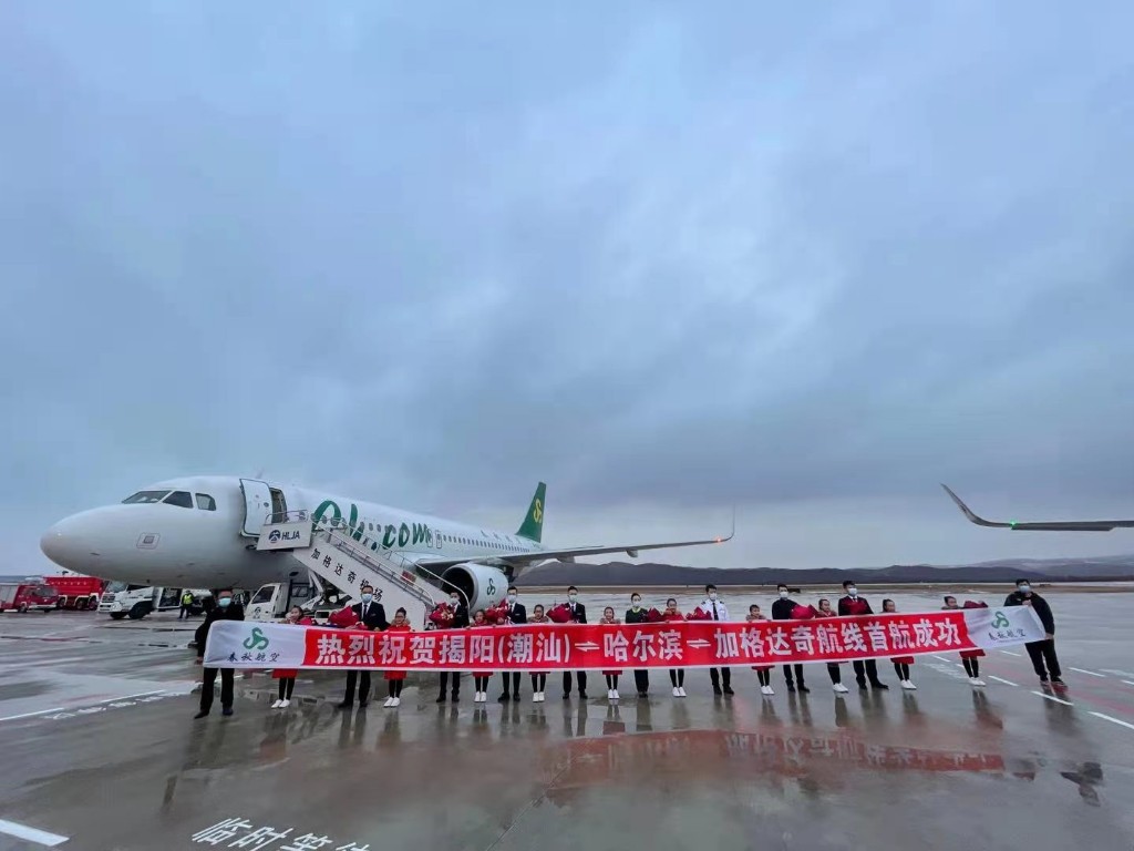 3月29日17時(shí)15分,在陣陣的引擎轟鳴聲中,由廣東揭陽(yáng)(潮汕)飛往加格達(dá)奇的首個(gè)航班準(zhǔn)時(shí)平穩(wěn)地降落在加格達(dá)奇嘎仙機(jī)場(chǎng),標(biāo)志著加格達(dá)奇—哈爾濱—揭陽(yáng)(潮汕)航線首航成功。30日,春秋航空還將首航加格達(dá)奇—哈爾濱—上海航線。