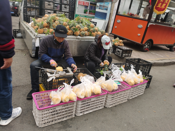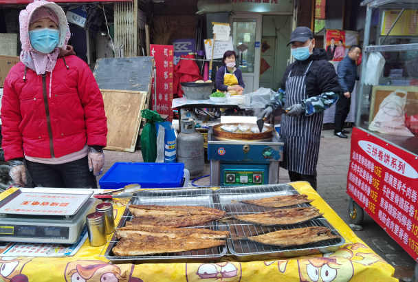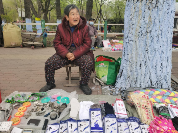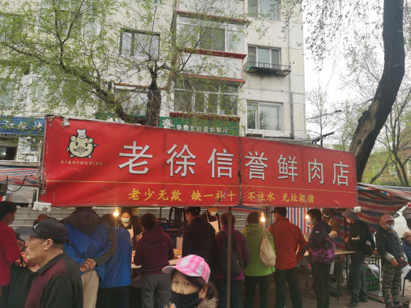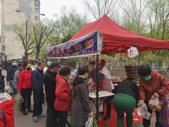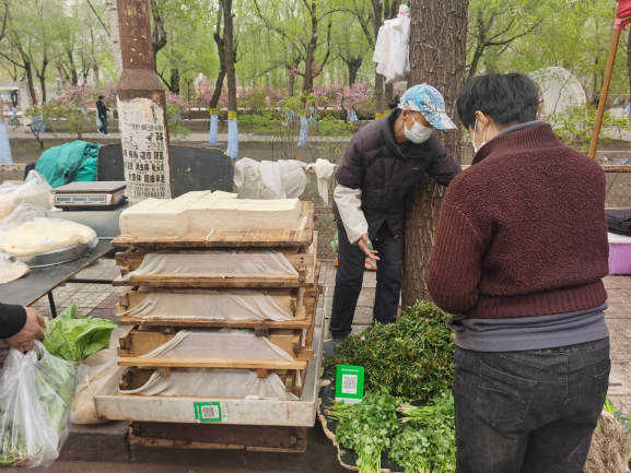早市的吸引力在于“看”。早市上,各攤主會(huì)想各種各樣的方式招攬顧客,有的會(huì)用廣告牌,有的會(huì)吆喝。早市上的商業(yè)運(yùn)作方式也非常有趣,比如現(xiàn)場(chǎng)擠羊奶,旁邊拴幾頭奶羊,當(dāng)招牌;賣刀切面的現(xiàn)場(chǎng)切,炸油條的現(xiàn)場(chǎng)炸,都是明檔手工,這幾乎是大多數(shù)早市商家的促銷手段。也有推銷老花鏡的,賣衣服的,會(huì)現(xiàn)場(chǎng)吆喝“正宗商品專柜,清倉(cāng)促銷”——這大概是現(xiàn)在“直播帶貨”的線下模式。住在早市附近的居民,有的會(huì)在樓上用繩子吊下個(gè)籃子,讓攤主把東西放到籃子里,直接拽上去。