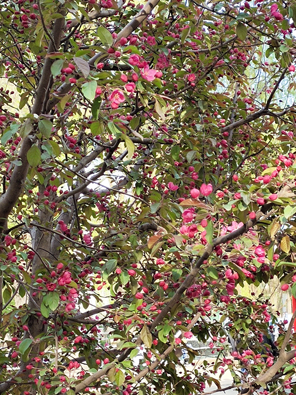 我省地處高海拔地區(qū),冬季寒冷,海棠能生長開花較為罕見。(祝東)
