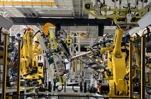 資料圖:江西上饒一家新能源電動汽車公司的智慧工廠內(nèi),機器人正同時作業(yè)?!±铐嵑?攝