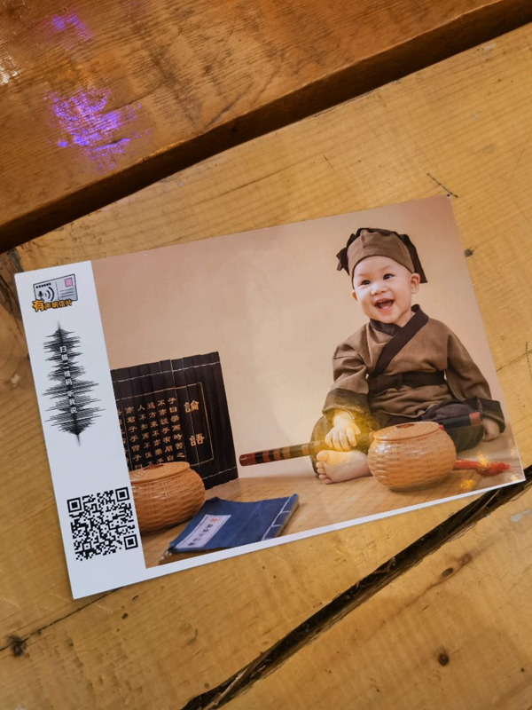 在這里,明信片不僅可以看,還能聽!館內(nèi)富有科技范兒的有聲明信片是最受歡迎的。用手機(jī)上傳照片,錄制一個(gè)30秒以內(nèi)的語音,這樣通過機(jī)器打印出來的明信片就有了新功能,只要用手機(jī)掃描明信片上的二維碼,就能聽到專屬寄語。