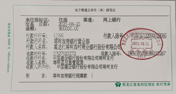 為更好地支持塔河縣應(yīng)對汛情,戰(zhàn)勝洪災(zāi), 6月21日,塔河農(nóng)商銀行在上級銀行的大力支持下,簡化手續(xù),特事特辦,第一時間向塔河縣人民政府捐贈救災(zāi)款項30萬元,用于塔河縣抗洪救災(zāi)工作,奉獻(xiàn)了農(nóng)商銀行廣大干部職工的一份愛心。