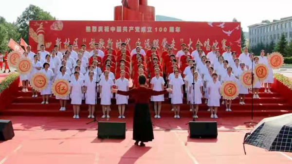 新林林業(yè)局機關黨委為現(xiàn)場觀眾展演《沒有共產黨就沒有新中國》《歌唱祖國》。大合唱現(xiàn)場舉行了黨旗傳遞活動,巨幅黨旗經過新林區(qū)局黨員干部職工緩緩傳遞。