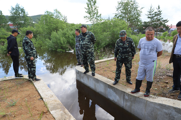 林業(yè)局黨委書記胡守慶(右四)深入汛情現(xiàn)場(chǎng),查看水位情況。