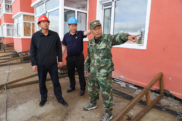 林業(yè)局黨委副書記、局長韓鳳泉(左一)登上莓苑小區(qū)3號(hào)樓,了解安裝鐵皮瓦防止一樓漏水情況。