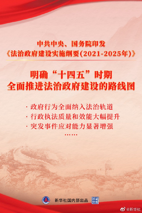 中共中央、國務(wù)院近日印發(fā)的《法治政府建設(shè)實施綱要(2021——2025年)》確立了今后五年法治政府建設(shè)的總體目標,明確到2025年,政府行為要全面納入法治軌道。綱要還提出,著力實現(xiàn)行政執(zhí)法水平普遍提升,努力讓人民群眾在每一個執(zhí)法行為中都能看到風清氣正、從每一項執(zhí)法決定中都能感受到公平正義。(新華社記者白陽 海報設(shè)計楊軼群)