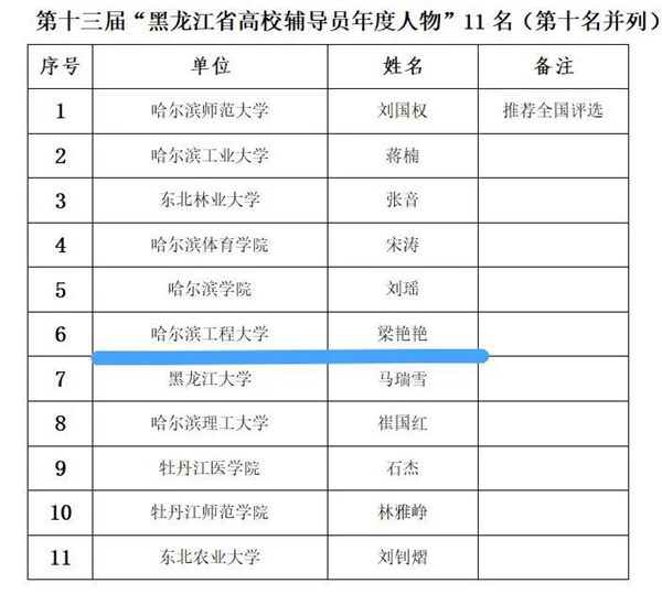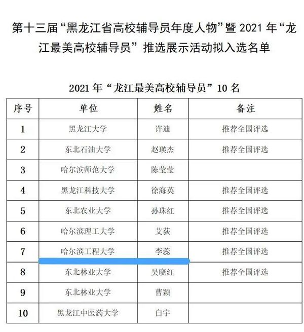 此次活動(dòng)共評(píng)選出“第十三屆黑龍江省高校輔導(dǎo)員年度人物”11名,“2021年龍江最美高校輔導(dǎo)員”10名。哈工程輔導(dǎo)員梁艷艷、李蕊憑借高水平的專(zhuān)業(yè)能力、優(yōu)異的工作業(yè)績(jī)以及認(rèn)真負(fù)責(zé)的工作精神,在眾多評(píng)選者中脫穎而出。