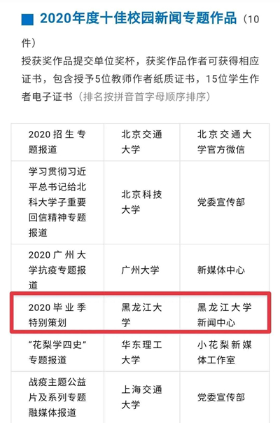 在2020年度全國百強校媒融合新聞專題評比中,黑龍江大學報送的《黑大2020畢業(yè)季特別策劃》憑借豐富的表現(xiàn)形式、多元新穎的報道主題和呈現(xiàn)角度、清晰合理的編排結構、強可讀性等綜合指標,經(jīng)過初審、復審、終審各環(huán)節(jié),獲評“2020年度十佳校園新聞專題作品”。
