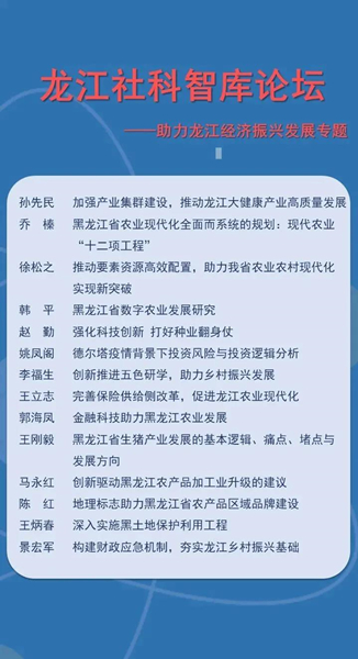 來自省內(nèi)高校、科研院所、企業(yè)的14位專家學(xué)者在會上圍繞“助力龍江經(jīng)濟(jì)振興發(fā)展”這一主題,分別就“加強(qiáng)產(chǎn)業(yè)集群建設(shè),推動龍江大健康產(chǎn)業(yè)高質(zhì)量發(fā)展”“黑龍江省農(nóng)業(yè)現(xiàn)代化全面而系統(tǒng)的規(guī)劃:現(xiàn)代農(nóng)業(yè)‘十二項(xiàng)工程’”“推動要素資源高效配置,助力我省農(nóng)業(yè)農(nóng)村現(xiàn)代化實(shí)現(xiàn)新突破”“黑龍江省數(shù)字農(nóng)業(yè)發(fā)展研究”等主題進(jìn)行了發(fā)言。
