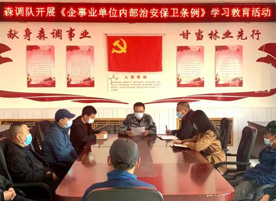 活動中,森林調查設計大隊首先成立了安全檢查工作組,明確檢查范圍和內容,并由主管安全保衛(wèi)負責人領學了《企事業(yè)單位內部治安保衛(wèi)條例》,要求全隊干部職工進一步提高政治站位,高度重視安全工作,嚴格落實安全責任制,認真執(zhí)行值班值守制度,及時做好安全信息登記和對上報告工作,繼續(xù)加強對進出單位人員的疫情監(jiān)控,著力保障企業(yè)內部穩(wěn)定。