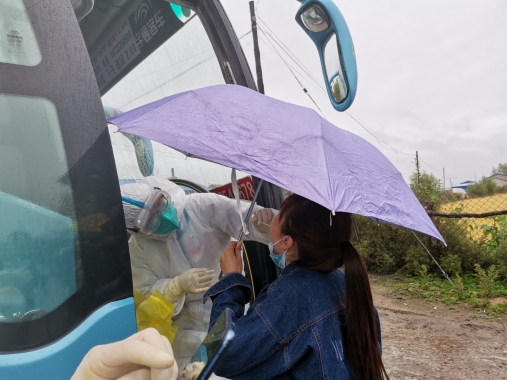 省醫(yī)院南崗院區(qū)中心手術室護士趙明裕,中秋節(jié)當天下午正在家中給八歲的大女兒過生日,接到通知需要支援巴彥縣核酸采集,親了親身邊的大女兒和四歲的小女兒,立即驅車前往醫(yī)院。到達巴彥后,趙明裕被分到后山鄉(xiāng),三人小組同組另兩位隊員都是年過40歲的大姐,已經(jīng)是預備黨員的趙明裕想想自己年輕一定要多干些,主動請纓承擔了更多的工作。當天,三人共完成了五個村屯近600人的采集,外面陰雨綿綿,氣溫驟降,手消涂在手套上,全手掌冰涼的感覺讓趙明裕本就著裝不多的身體愈發(fā)冰冷,但想到臨行前醫(yī)院同事一次次的叮嚀與囑托,她心中堅信,抗疫必勝。同時當?shù)卮迕竦臒崆橐沧屭w明裕的心里暖暖的,后山鄉(xiāng)政府的工作人員和人民群眾都非常積極的配合,尤其是老人和小孩,并沒有由于天氣陰雨綿綿的原因而不配合,都在鄉(xiāng)領導的指揮下,井然有序的配合著。