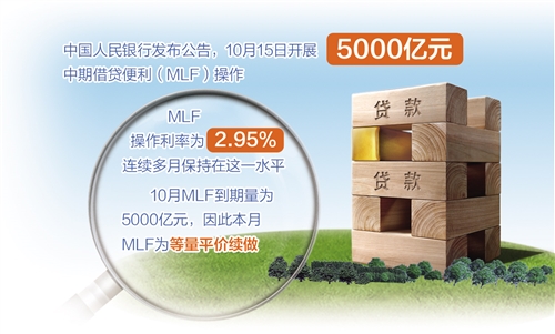 10月15日,月中“麻辣粉”(MLF)如期端出。中國人民銀行發(fā)布公告稱,為維護(hù)銀行體系流動性合理充裕,15日開展5000億元中期借貸便利(MLF)操作(含對10月15日MLF到期的續(xù)做)。MLF操作利率為2.95%,與9月持平,并連續(xù)多月保持在這一水平。10月MLF到期量為5000億元,因此本月MLF為等量平價(jià)續(xù)做。