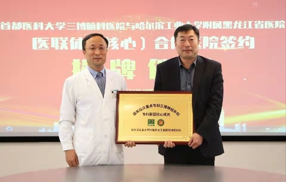 黑龍江省醫(yī)院黨委書記劉宏石、副院長(zhǎng)陳鵬,首都醫(yī)科大學(xué)三博腦科醫(yī)院院長(zhǎng)徐向英、黨委書記王保國(guó)、副院長(zhǎng)張宏偉等領(lǐng)導(dǎo)出席,并為牌匾揭牌。黑龍江省醫(yī)院神經(jīng)外二科程化坤主任、護(hù)理部冷菲菲主任及三博腦科醫(yī)院相關(guān)科室負(fù)責(zé)人等參加了本次簽約揭牌儀式。