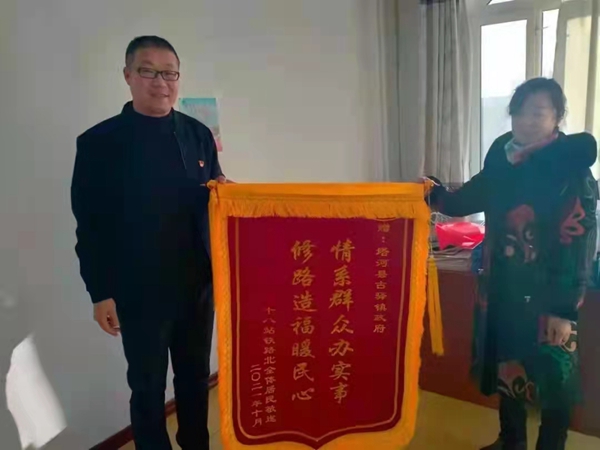 “路修好了,交通順暢了,心情也好了!”對眼前這條寬敞、整潔的道路,鐵路北居民帶著喜悅的笑容紛紛向古驛鎮(zhèn)工作人員豎起了大拇指,并為古驛鎮(zhèn)黨委、政府送去了“情系群眾辦實事,修路造福暖民心”錦旗。