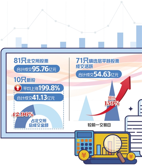 北交所首個交易日運(yùn)行平穩(wěn),81只股票合計(jì)成交95.76億元。首批上市交易的10只新股全線上揚(yáng),盤中均觸發(fā)兩次臨時停牌。截至收盤,10只新股平均較發(fā)行價上漲199.80%。71只從精選層平移至北交所的股票漲跌互現(xiàn)。
