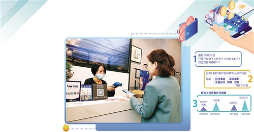 《中國(guó)數(shù)字人民幣的研發(fā)進(jìn)展白皮書》公布的數(shù)據(jù)顯示,截至今年6月30日,共開通個(gè)人錢包2087萬余個(gè)。而最新數(shù)據(jù)顯示,截至10月22日,已經(jīng)開立數(shù)字人民幣個(gè)人錢包1.4億個(gè)。