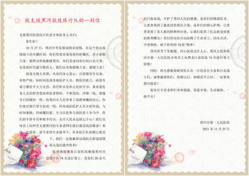 據(jù)介紹,省醫(yī)院支援黑河應(yīng)急醫(yī)療隊(duì)共收治新冠肺炎患者69人,其中重癥1例,最小的患者2歲,最大的患者90歲,在兄弟單位接手前,共治愈出院35人。治療期間,醫(yī)療隊(duì)收到了多封患者表?yè)P(yáng)信,小患者們則用畫筆表達(dá)了對(duì)天使們的感謝與敬仰,有的未出院患者聽說(shuō)省醫(yī)院醫(yī)療隊(duì)要離開了,都依依不舍,紛紛表達(dá)對(duì)醫(yī)療隊(duì)精湛的醫(yī)技和暖心醫(yī)療的感謝。