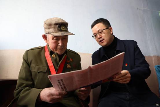 阿木爾林業(yè)局黨委委員、宣傳部部長高樹源(右)走進老黨員張俊峰家中,宣傳黨的十九屆六中全會精神(王力攝)