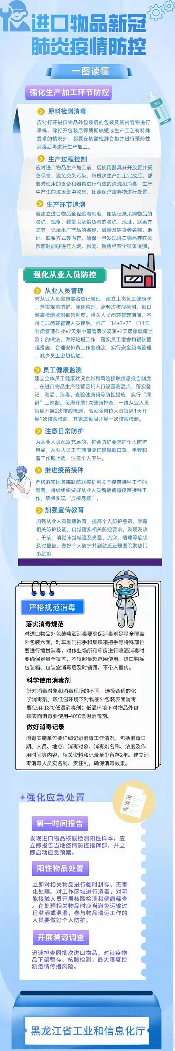 公開(kāi)信表示,近期疫情反彈形勢(shì)嚴(yán)峻復(fù)雜,為確保工業(yè)企業(yè)不發(fā)生聚集性疫情,共同構(gòu)筑疫情防控堅(jiān)固防線,提示:涉及進(jìn)口物品加工、使用的工業(yè)企業(yè)要嚴(yán)格按照《黑龍江省進(jìn)口物品新冠肺炎疫情風(fēng)險(xiǎn)防控工作方案》落實(shí)各項(xiàng)防疫措施。一要強(qiáng)化生產(chǎn)加工環(huán)節(jié)的防控。生產(chǎn)前做好原料檢測(cè)消毒,生產(chǎn)中做好過(guò)程控制,設(shè)備和器具進(jìn)行有效的清洗和消毒避免交叉污染,產(chǎn)生的垃圾集中收集,比照醫(yī)療廢棄物進(jìn)行處置。建立進(jìn)口物品全程追溯制度,確保一旦發(fā)現(xiàn)進(jìn)口物品存在風(fēng)險(xiǎn)源時(shí)能夠進(jìn)行入境、物流、銷(xiāo)售經(jīng)營(yíng)全鏈條追溯。二要強(qiáng)化從業(yè)人員防控。對(duì)員工實(shí)施實(shí)名登記管理,做好員工健康監(jiān)測(cè)和核酸檢測(cè),合理安排作業(yè)班次,減少密切接觸。配發(fā)充足并符合防護(hù)要求的個(gè)人防護(hù)用品,加強(qiáng)員工健康教育,提高個(gè)人防護(hù)意識(shí)。嚴(yán)格落實(shí)當(dāng)?shù)仃P(guān)于疫苗接種工作的部署,持續(xù)組織做好員工新冠病毒疫苗接種工作,確保實(shí)現(xiàn)“應(yīng)接盡接”。三要嚴(yán)格規(guī)范消毒。對(duì)進(jìn)口物品外包裝、加工場(chǎng)所、車(chē)廂門(mén)把手和集裝箱把手等要嚴(yán)格按照規(guī)范消毒,消毒時(shí)要確保足量全覆蓋并針對(duì)消毒對(duì)象和消毒現(xiàn)場(chǎng)的不同選擇合適的化學(xué)消毒劑。詳細(xì)記錄消毒工作情況,建立消毒人員實(shí)名制、責(zé)任制,確保消毒效果。四要強(qiáng)化應(yīng)急處置。發(fā)現(xiàn)進(jìn)口物品核酸監(jiān)測(cè)陽(yáng)性樣本,應(yīng)立即報(bào)告當(dāng)?shù)匾咔榉揽刂笓]部,并同步啟動(dòng)應(yīng)急預(yù)案。對(duì)相關(guān)物品進(jìn)行臨時(shí)封存、無(wú)害化處理,對(duì)工作區(qū)域進(jìn)行消毒,對(duì)可能接觸的人員開(kāi)展核酸檢測(cè)和健康篩查。迅速排查同批次進(jìn)口物品,最大限度控制疫情傳播風(fēng)險(xiǎn)。