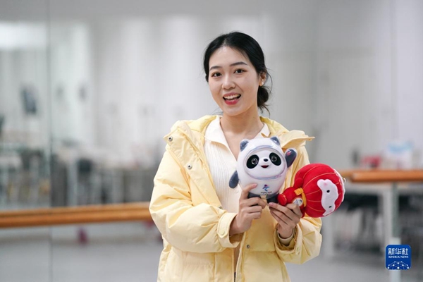 北京郵電大學(xué)的學(xué)生志愿者曹夢(mèng)鴿手捧北京2022年冬奧會(huì)和冬殘奧會(huì)吉祥物做自我介紹(12月15日攝)。