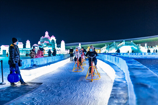 今年園區(qū)的另一個(gè)“人氣王”,非單車城堡莫屬。單車城堡內(nèi)的冰上自行車項(xiàng)目,每天都吸引著大量游客騎行體驗(yàn)。在冰面上掌控方向不是件容易事,騎著冰上自行車,穿行于美麗的冰城堡中,對(duì)游客來(lái)說(shuō)是一種前所未有的奇妙體驗(yàn)。