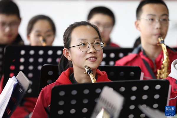 2022年寒假,在甘肅省白銀市會(huì)寧縣,會(huì)師中學(xué)交響管樂團(tuán)的孩子們?cè)谕瓿珊僮鳂I(yè)之余排練《紅旗頌》。早在2011年,會(huì)寧縣會(huì)師中學(xué)就東挪西借組建了第一個(gè)交響樂樂團(tuán)。平時(shí),學(xué)校為樂團(tuán)的學(xué)生免費(fèi)上樂器課,學(xué)生自愿報(bào)名參加、自愿購買小型樂器。如今,《紅旗頌》《長征組歌》等已成為樂團(tuán)的保留曲目。