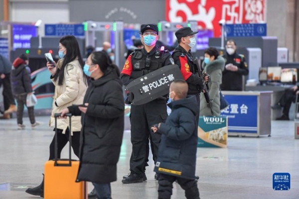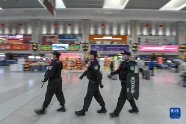 1月20日,在長春火車站候車大廳,馬宇航(右一)與同事一起巡邏。