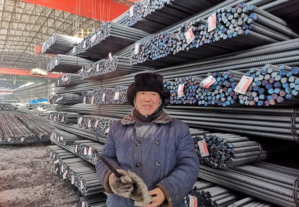 在鋼材成口庫,一位身穿工裝大棉襖、頭戴棉帽,捂得嚴(yán)嚴(yán)實(shí)實(shí),臉色微紅的,帽沿掛滿了霜的工人十分引人注目。他叫朱世軍,是軋鋼廠發(fā)運(yùn)作業(yè)區(qū)丙班的一名普通司索操作員,初一正是白班,主要負(fù)責(zé)鋼材裝運(yùn)掛鉤和為火車車皮用鐵線鎖車門工作,一但發(fā)運(yùn)繁忙時(shí),無論白班還是夜班都得在室外作業(yè)裝車,企業(yè)鋼材就靠他們配合裝上火車發(fā)往市場(chǎng)的?!敖裉斓冒l(fā)運(yùn)鋼材110車左右,每天上班,在成品庫得上上下下,得走好幾里地,今天就挺冷啊,最低零下26度,冷風(fēng)吹的嘴都木了,既使戴著棉手套,手也都凍僵了,但是,每天一想到通過我的努力,把建龍西鋼鋼材發(fā)往全國(guó)各地,為建龍西鋼美好企業(yè)建設(shè)做貢獻(xiàn),我雖然冷點(diǎn)但心里熱乎乎的,真心感到驕傲和自豪。