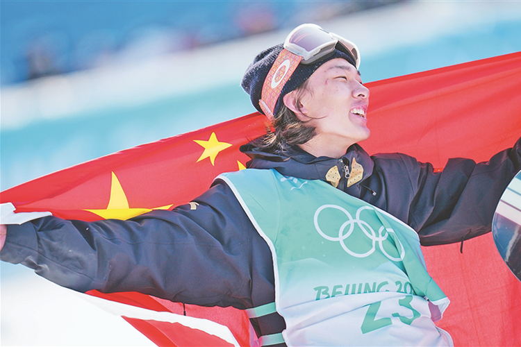 2月15日,中國選手蘇翊鳴在奪冠后慶祝。 當(dāng)日,北京2022年冬奧會單板滑雪男子大跳臺決賽在北京首鋼滑雪大跳臺舉行。中國選手蘇翊鳴奪得金牌。