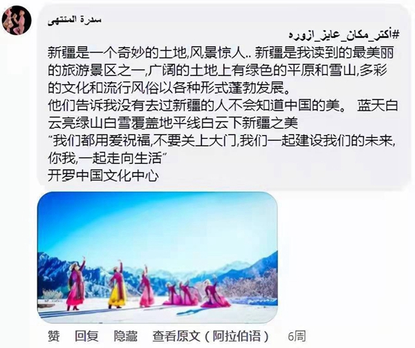 其中,來自埃及曼蘇拉的西德拉·蒙塔哈獲得本次活動(dòng)的“最佳評論獎(jiǎng)”。她在中心帖文下多次留言,“新疆風(fēng)景迷人,是最美的旅游勝地之一。在廣袤的土地上有草原和雪山,沒有去過新疆的人,就不會(huì)知道中國的美……我想去那里滑雪、騎馬?!绷硗?,她還想去北京吃炸醬面,去遼寧泡溫泉等。