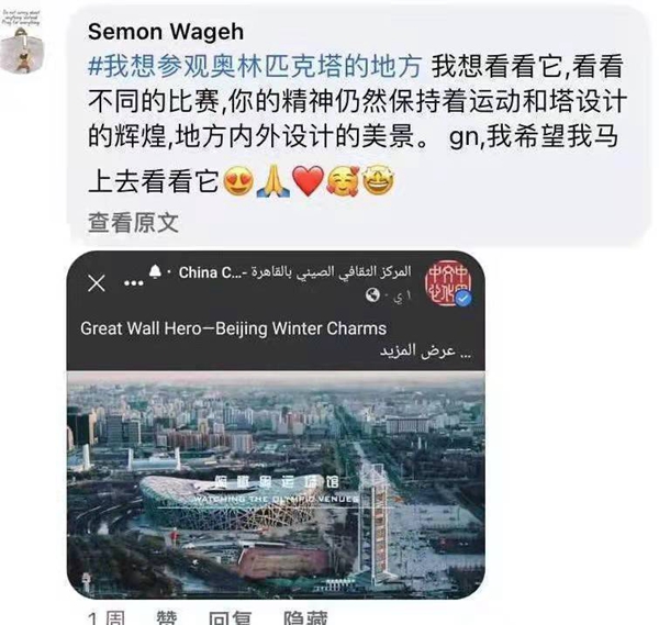 2022年年初,根據(jù)埃及社會(huì)、文化特點(diǎn)和民眾喜好,開羅中國文化中心創(chuàng)新推出了2022“北方冰雪旅游海外推廣季”之“我最想去的地方”線上評選活動(dòng),邀請埃及各界友人參與話題互動(dòng),在中心主題帖文下寫出自己最想去的中國省份(或城市)及原因,曬出旅游目的地圖片并打上話題標(biāo)簽等?;顒?dòng)一經(jīng)推出,即受到埃及民眾的廣泛關(guān)注,網(wǎng)友們紛紛在中心臉書帖文下留言并轉(zhuǎn)發(fā),評選自己“最想去的中國冰雪旅游勝地”,并熱情附上自己之前在華留學(xué)、訪問、旅游、生活的旅游體驗(yàn)和文化閱歷,活動(dòng)二次外溢效應(yīng)明顯,二次傳播效果良好,旅游推廣和文化傳播的效果遠(yuǎn)遠(yuǎn)高于預(yù)期。活動(dòng)期間,該活動(dòng)