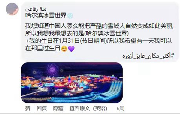 開羅中國文化中心臉書主頁超級粉絲艾曼·索比、曼娜·伊薩姆和羅飛三位網(wǎng)友獲得了優(yōu)秀評論獎(jiǎng)。艾曼·索比在留言中提出想去黑龍江大慶泡雪地溫泉;曼娜·伊薩姆在評論里說她想去哈爾濱極地公園游玩,想去牡丹江鏡泊湖的冰瀑跳水,想去吉林的查干湖看看;羅飛表示想到哈爾濱冰雪大世界去過生日。眾多網(wǎng)友也紛紛曬出了自己最想去的地方,新聞與媒體從業(yè)者加達(dá)·阿里想先去遼寧的滑雪場,然后再去采摘丹東的草莓;來自明亞省的緒瑪·穆斯塔法表示想去內(nèi)蒙古東方冰雪小城阿爾山旅游;畢業(yè)于蘇哈格大學(xué)的薩蒙·瓦赫想去北京看奧林匹克塔等。網(wǎng)友們各抒己見,暢想去中國的夢幻旅程。