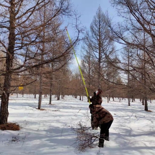 嚴格技術操作,科學采集枝條。按照《大興安嶺森林培育技術規(guī)范》中的“標準枝法”采集。生產(chǎn)人員深入到種子園優(yōu)良林分中,以興安落葉松林地域內(nèi)優(yōu)質(zhì)目標樹為宜,分別對樹的陰陽兩面和林相的南北面進行采集枝條,按照樹的上、中、下和南北隨機抽取10—15株優(yōu)樹,每株各采兩組枝條,每株樹采集六個枝條,枝條長度為1.5米以上,對采集枝條陽上、陽中、陽下,陰上、陰中、陰下方位分別用標簽標記,進行捆扎,并記錄好林班、小班、林齡和坐標點。