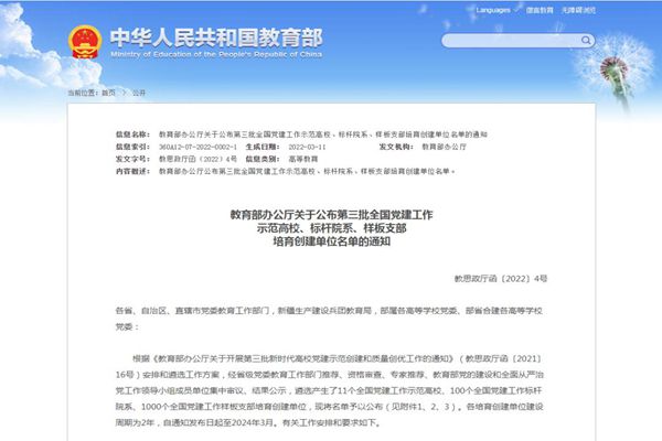 根據(jù)《教育部辦公廳關(guān)于開展第三批新時(shí)代高校黨建示范創(chuàng)建和質(zhì)量創(chuàng)優(yōu)工作的通知》(教思政廳函〔2021〕16號(hào))安排,經(jīng)省級(jí)黨委教育工作部門推薦、專家評(píng)審等環(huán)節(jié),教育部遴選產(chǎn)生了11個(gè)全國黨建工作示范高校、100個(gè)全國黨建工作標(biāo)桿院系、1000個(gè)全國黨建工作樣板支部培育創(chuàng)建單位。各培育創(chuàng)建單位建設(shè)周期為2年,自通知發(fā)布日起至2024年3月。