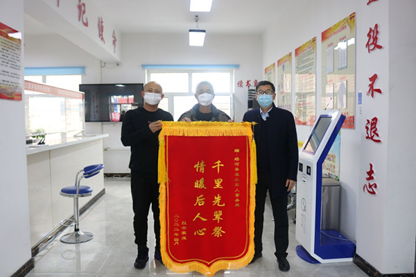 離開塔河前,老人拿著錦旗來(lái)到縣退役軍人服務(wù)中心。他表示,此行受到工作人員如家人般的接待十分暖心,對(duì)陵園的管理非常認(rèn)可和感謝。時(shí)隔55年,跨越3300多公里,安邦勤老人終圓夢(mèng)。