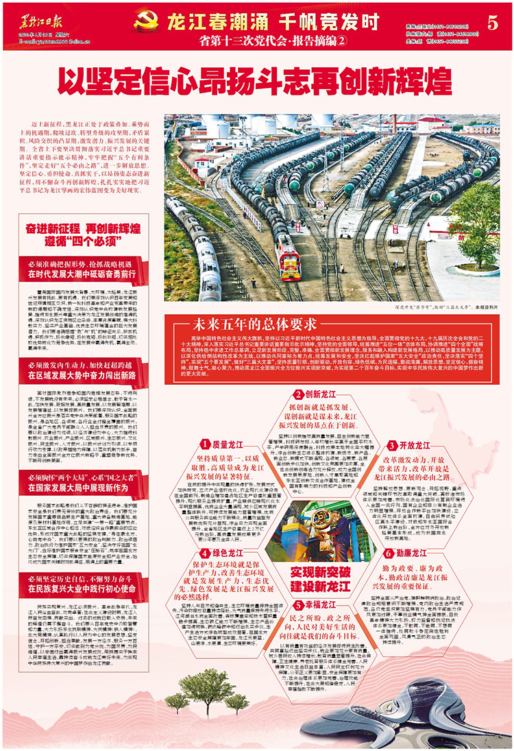 邁上新征程,黑龍江正處于政策疊加、乘勢(shì)而上的機(jī)遇期,爬坡過(guò)坎、轉(zhuǎn)型升級(jí)的攻堅(jiān)期,矛盾累積、風(fēng)險(xiǎn)交織的凸顯期,激發(fā)潛力、振興發(fā)展的關(guān)鍵期。全省上下要堅(jiān)決貫徹落實(shí)習(xí)近平總書(shū)記重要講話重要指示批示精神,牢牢把握“五個(gè)有利條件”,堅(jiān)定走好“五個(gè)必由之路”,進(jìn)一步解放思想、堅(jiān)定信心、勇?lián)姑⒄孀?shí)干,以昂揚(yáng)姿態(tài)奮進(jìn)新征程,用不懈奮斗再創(chuàng)新輝煌,扎扎實(shí)實(shí)地把習(xí)近平總書(shū)記為龍江擘畫(huà)的宏偉藍(lán)圖變?yōu)槊篮矛F(xiàn)實(shí)。