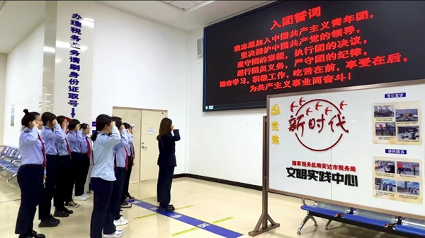 重溫入團(tuán)誓詞,匯聚青春力量。為進(jìn)一步引導(dǎo)廣大團(tuán)員青年厚植愛國(guó)、愛黨、愛稅收事業(yè)的深厚情感,進(jìn)一步增強(qiáng)團(tuán)支部的組織力量,安達(dá)市稅務(wù)局團(tuán)支部開展重溫入團(tuán)誓詞活動(dòng),在莊嚴(yán)的團(tuán)歌聲中,11名安達(dá)市稅務(wù)局奮戰(zhàn)在稅收一線的團(tuán)員干部在團(tuán)支部書記的帶領(lǐng)下,面向誓詞莊嚴(yán)宣誓。宣誓完畢后,安達(dá)稅務(wù)青年紛紛表示,將立足本職、埋頭苦干,用一流的業(yè)務(wù)能力為納稅人繳費(fèi)人帶來一流的納稅服務(wù)體驗(yàn),為安達(dá)稅收事業(yè)奉獻(xiàn)青春力量。