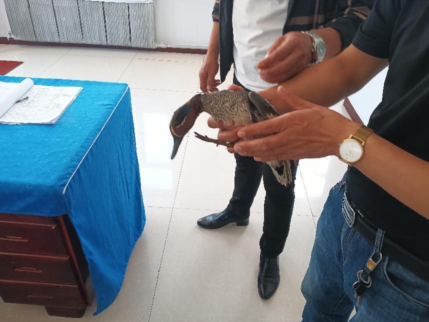 工作人員正在對綠翅鴨進(jìn)行檢查救助