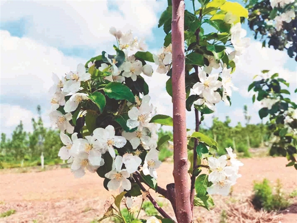 從尚志林場放眼望去,270畝寒地林果栽培示范基地在藍天白云的映襯下顯得頗為壯觀。龍豐、海棠、雞心果等萬余株寒地林果整齊排列,枝頭花朵競相綻放。