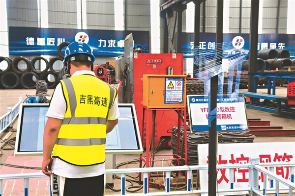 鋼筋加工車(chē)間里一處3D立體投影,讓工人們可以直觀看到自己加工后的構(gòu)件將用于整體鋼筋骨架的哪個(gè)部位。任書(shū)法說(shuō),吉黑高速項(xiàng)目打造智慧梁廠,采用了數(shù)控鋼筋滾焊機(jī)、數(shù)控鋼筋剪切生產(chǎn)線、數(shù)控鋼筋彎曲中心+自動(dòng)上料配套等設(shè)備,以前這么大的加工廠要30多人,現(xiàn)在只需一半的人力,就能干出兩倍的工作量,極大提高了施工精度和效率。