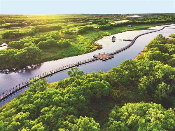 在黑瞎子島濕地公園,登上全景平臺,游客可以一覽濕地全貌,體會親水、親綠、親近自然的愜意。2256米的漂浮式木棧道九曲回廊,浮筒的設(shè)計使浮橋水漲橋漲、水降橋降。