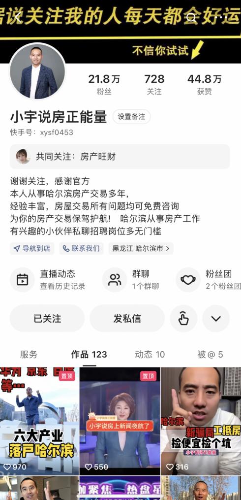 “松北這個小區(qū),現(xiàn)房7000起步”、“這里是江南核心商業(yè)圈,通勤便利”、“這可以說是哈爾濱二環(huán)旁配套設(shè)施最全的樓盤”……晚上8點,每當(dāng)夜幕降臨,房產(chǎn)主播小宇(快手ID:xysf0453)會準(zhǔn)時出現(xiàn)在快手平臺直播間,為廣大有購房需求的客戶答疑解惑。