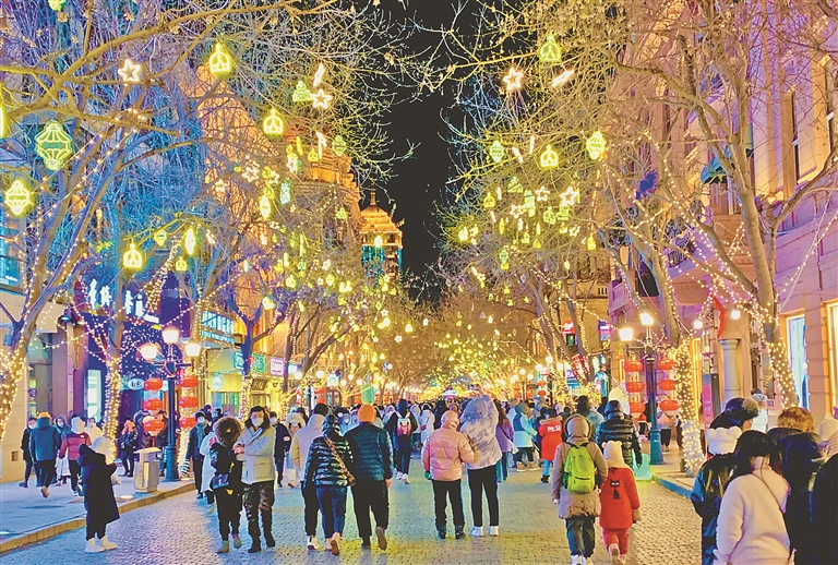 穿過歐式建筑,滿滿冰城風情的彩燈以及年味十足的大紅燈籠將哈爾濱中央大街點亮。2023年新年伊始,百年老街呈現(xiàn)出游人如織的火熱場面,熟悉又熱鬧的氣氛彌漫在老街的各個角落,煙火氣持續(xù)升騰。欣賞唯美的陽臺音樂秀,品嘗鍋包肉、馬迭爾冰棍等特色美食,打卡“星空燈”、“雪妮妮網(wǎng)紅兔子”雪雕……游客和市民沉浸在一個個融合創(chuàng)意與冰城特色的冰雪玩法和體驗之中,盡情享受冰雪帶來的歡樂。數(shù)據(jù)顯示,僅春節(jié)期間,中央大街日均客流量維持在40萬人次,高峰時期達到70余萬人次。