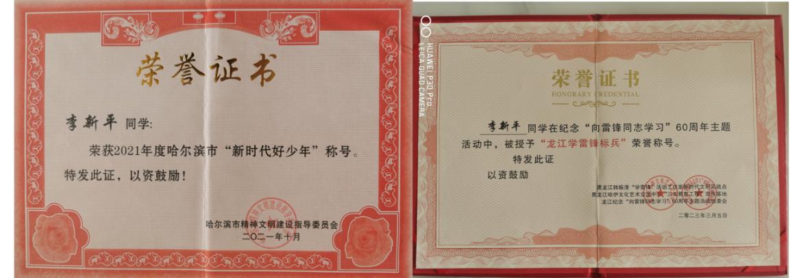 李新平同學(xué)就讀于呼蘭區(qū)建國(guó)小學(xué)五年五班,他勤奮好學(xué)、品學(xué)兼優(yōu)、樂(lè)觀向上、自強(qiáng)自立。從一年級(jí)開(kāi)始就擔(dān)任班長(zhǎng)職務(wù),先后多次被評(píng)為三好學(xué)生、優(yōu)秀學(xué)生干部、優(yōu)秀少先隊(duì)員,榮獲2021年度哈爾濱市“新時(shí)代好少年”稱(chēng)號(hào)、榮獲2021年第三屆龍江好少年活動(dòng)“龍江愛(ài)心大使”和“城市形象大使”,2022年被黑龍江省積善之家?guī)头鲋行那嗌倌曛驹刚呖傟?duì)授予“公益達(dá)人”稱(chēng)號(hào),2023年在紀(jì)念“向雷鋒同志學(xué)習(xí)”60周年主題活動(dòng)中被韓振清學(xué)雷鋒創(chuàng)新工作室授予“龍江學(xué)雷鋒標(biāo)兵”榮譽(yù)稱(chēng)號(hào)。在多類(lèi)體育運(yùn)動(dòng)競(jìng)賽活動(dòng)中獲得等級(jí)證書(shū)及榮譽(yù)稱(chēng)號(hào),出色的表現(xiàn)和真誠(chéng)的付出,贏得了大家的信任、同學(xué)們的信賴(lài)、家長(zhǎng)們的喜愛(ài)。
