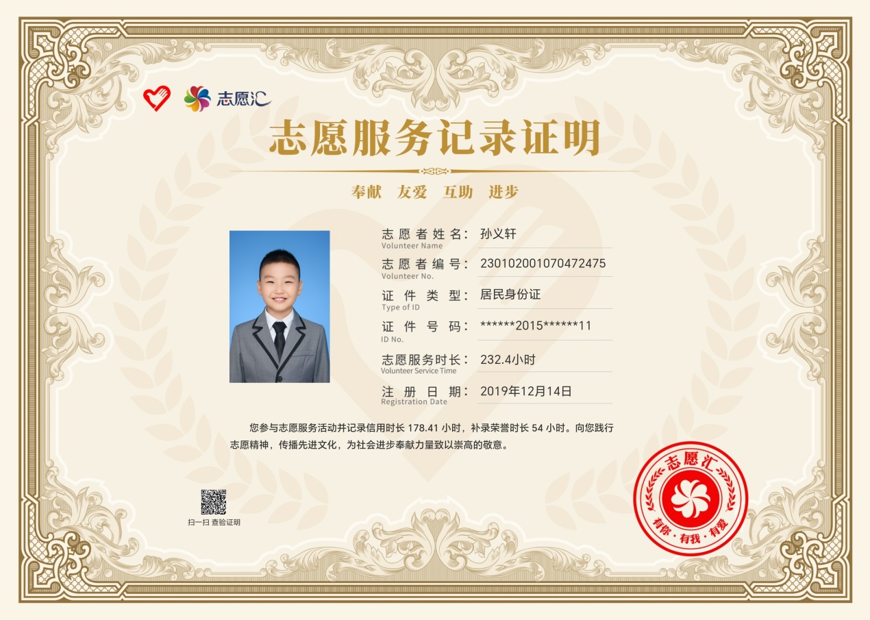 黑龍江經(jīng)濟網(wǎng)訊(楊東生)從2019年12月14日起累計參加志愿服務178小時,學?!翱酆萌松谝涣?圩印眱?yōu)秀表演獎獲得者,哈爾濱廣播電視臺生活頻道愛心公益聯(lián)盟優(yōu)秀志愿者,黑龍江省青少年發(fā)展基金會“我與小樹共成長”參與者……他就是來自哈爾濱市江沿小學三年一班的孫義軒同學。