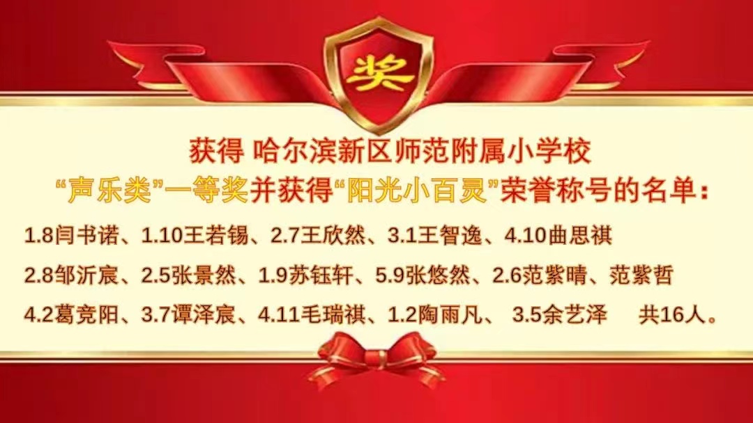 閆書諾同學(xué)的班主任馬男老師很重視孩子們的全面發(fā)展,鼓勵孩子們積極參加各種文體活動。在馬老師的積極引導(dǎo)下,閆書諾同學(xué)在學(xué)校藝術(shù)節(jié)的聲樂比賽中,以一曲《童心向黨》喜獲“聲樂類”一等獎和“陽光小百靈”榮譽稱號。